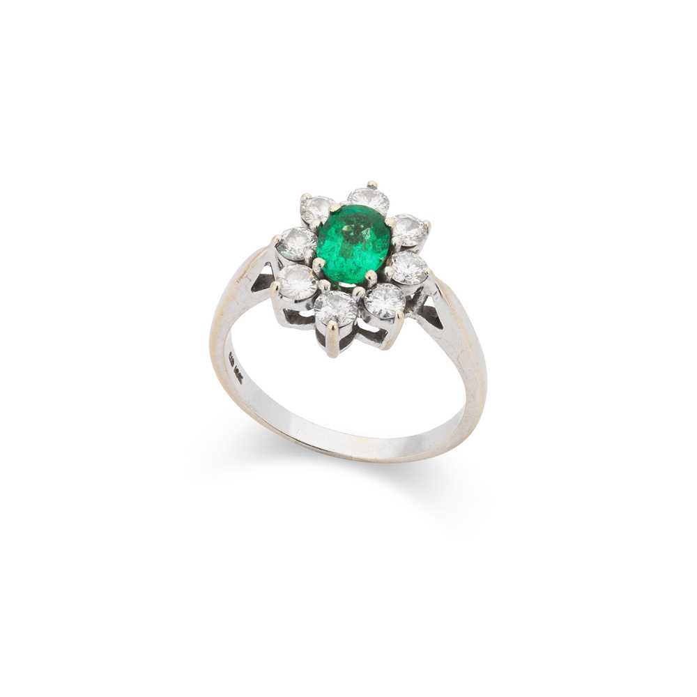 Claw-set with an oval-cut emerald, weighing approximately 0.66cts, in a border of round brilliant-cut diamonds, stamped 18k