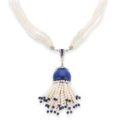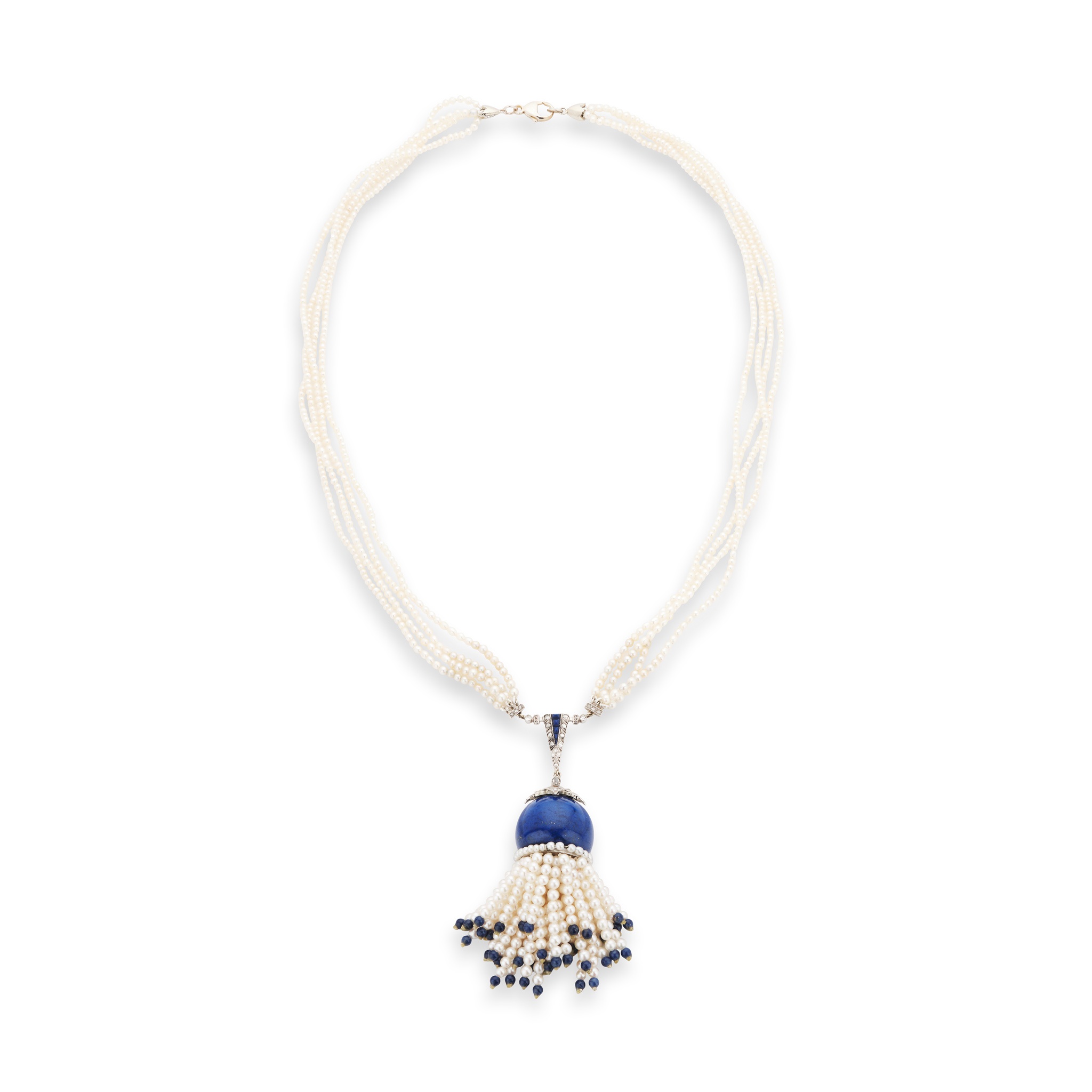 The necklace composed of four strands of pearls (untested) to rose-cut diamond mounts, suspending an angular link of eight-cut diamonds and lapis lazuli cabochons, to a rose-cut diamond surmount and a large lapis lazuli bead, suspending various graduated pearl and lapis lazuli tassels