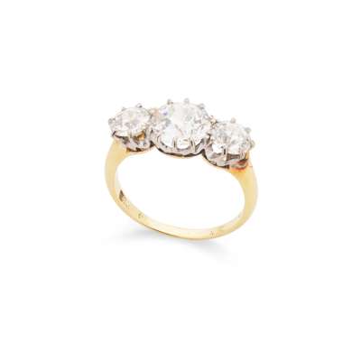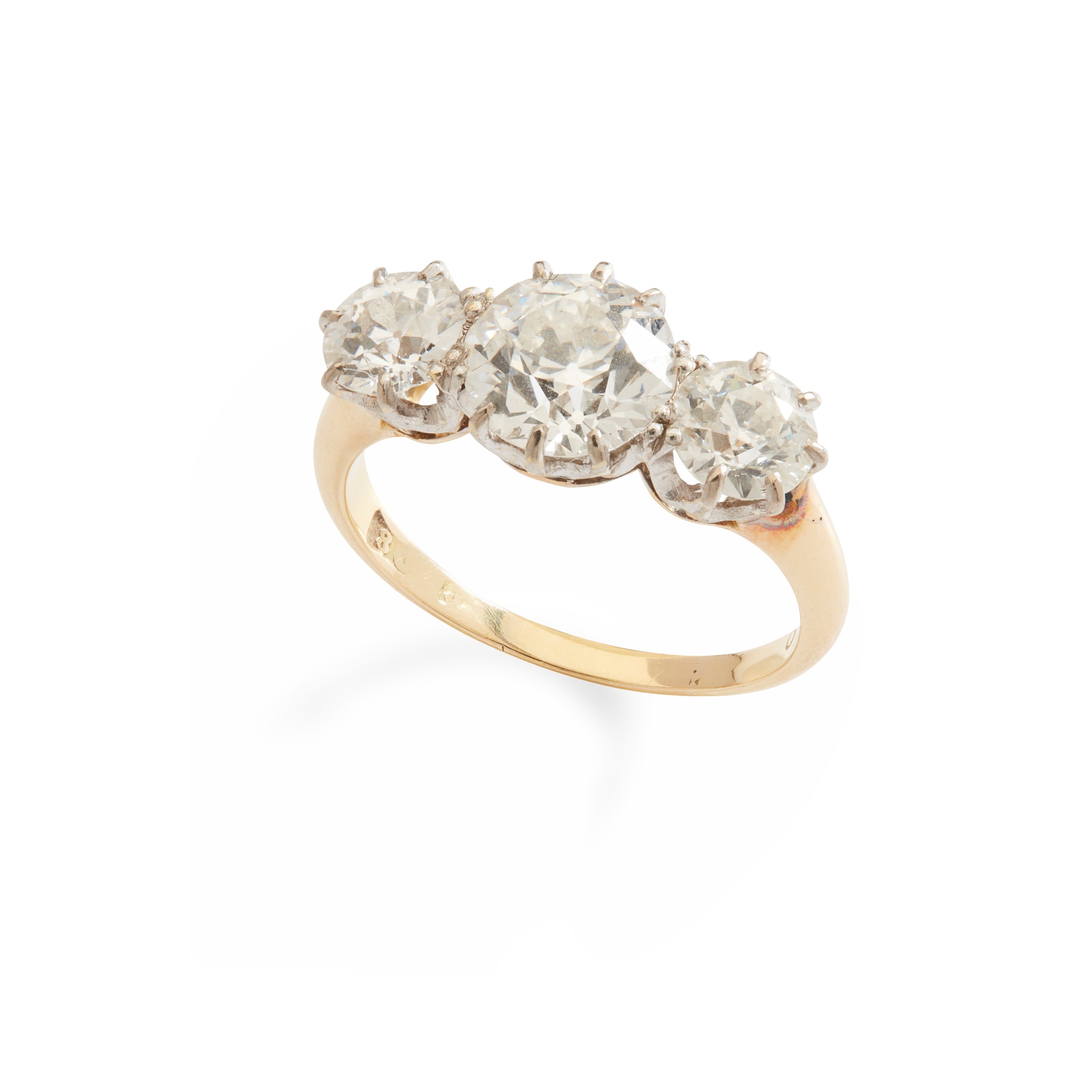 Claw-set with three graduated old round-cut diamonds, the largest weighing approximately 1.75cts, indistinctly marked