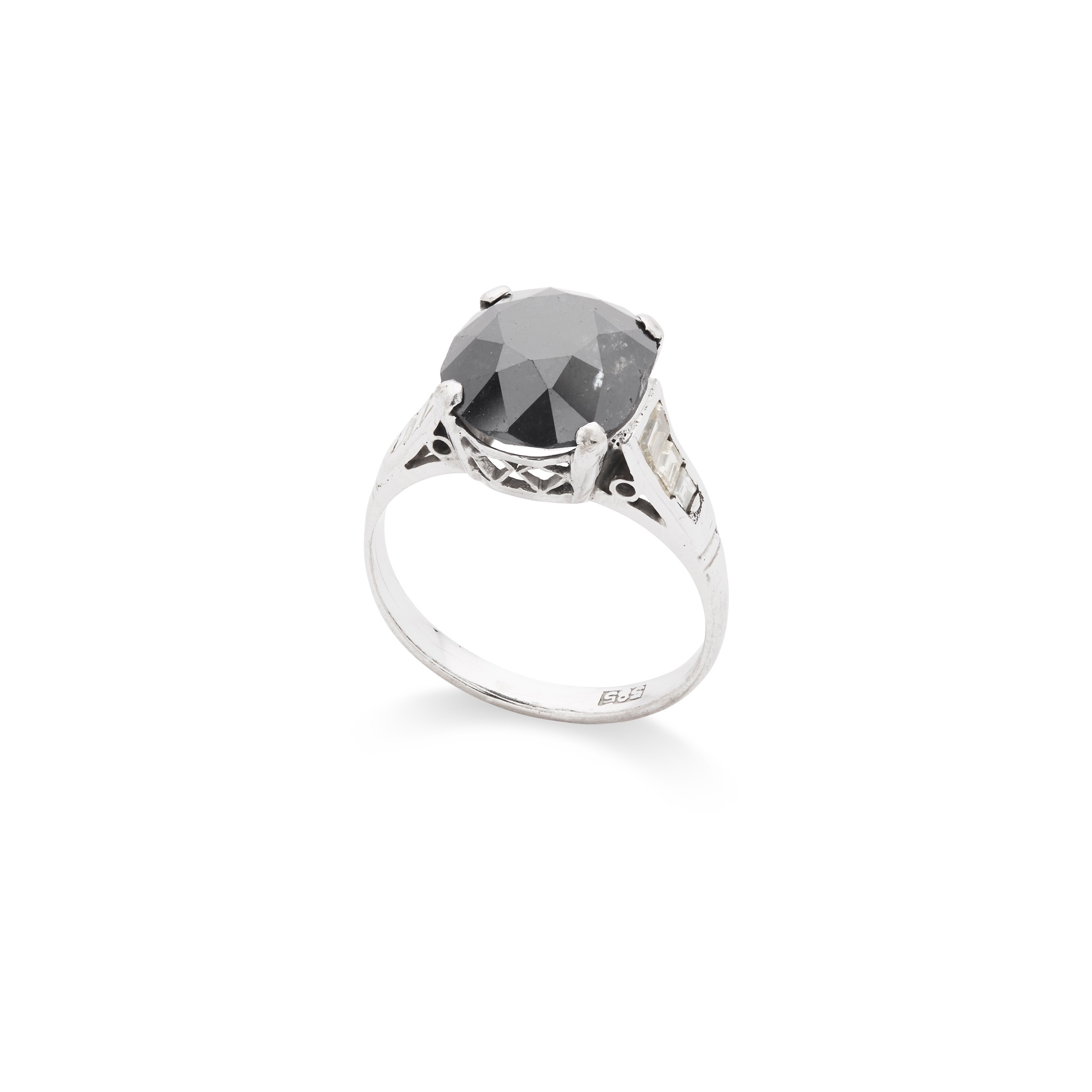 Claw-set with a cushion-cut black diamond, weighing approximately 5.20cts, each shoulder set with three baguette-cut diamonds, stamped 585