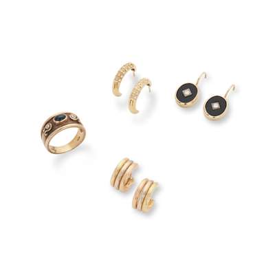 Including a 9ct gold ring, collet-set with a cabochon sapphire and two small round brilliant-cut diamonds; a pair of onyx and diamond earrings, stamped 9; and two pairs of hoop earrings