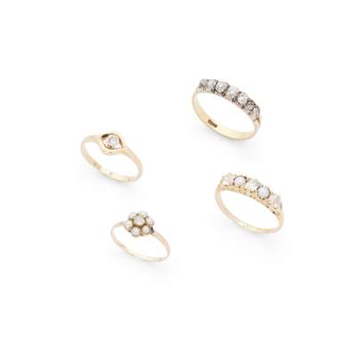 Including a pearl and old-cut diamond ring, indistinctly marked; a pearl and diamond cluster ring, unmarked; a single-stone diamond ring, stamped 585; and a ring set with six old-cut diamonds (one missing), indistinctly marked