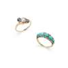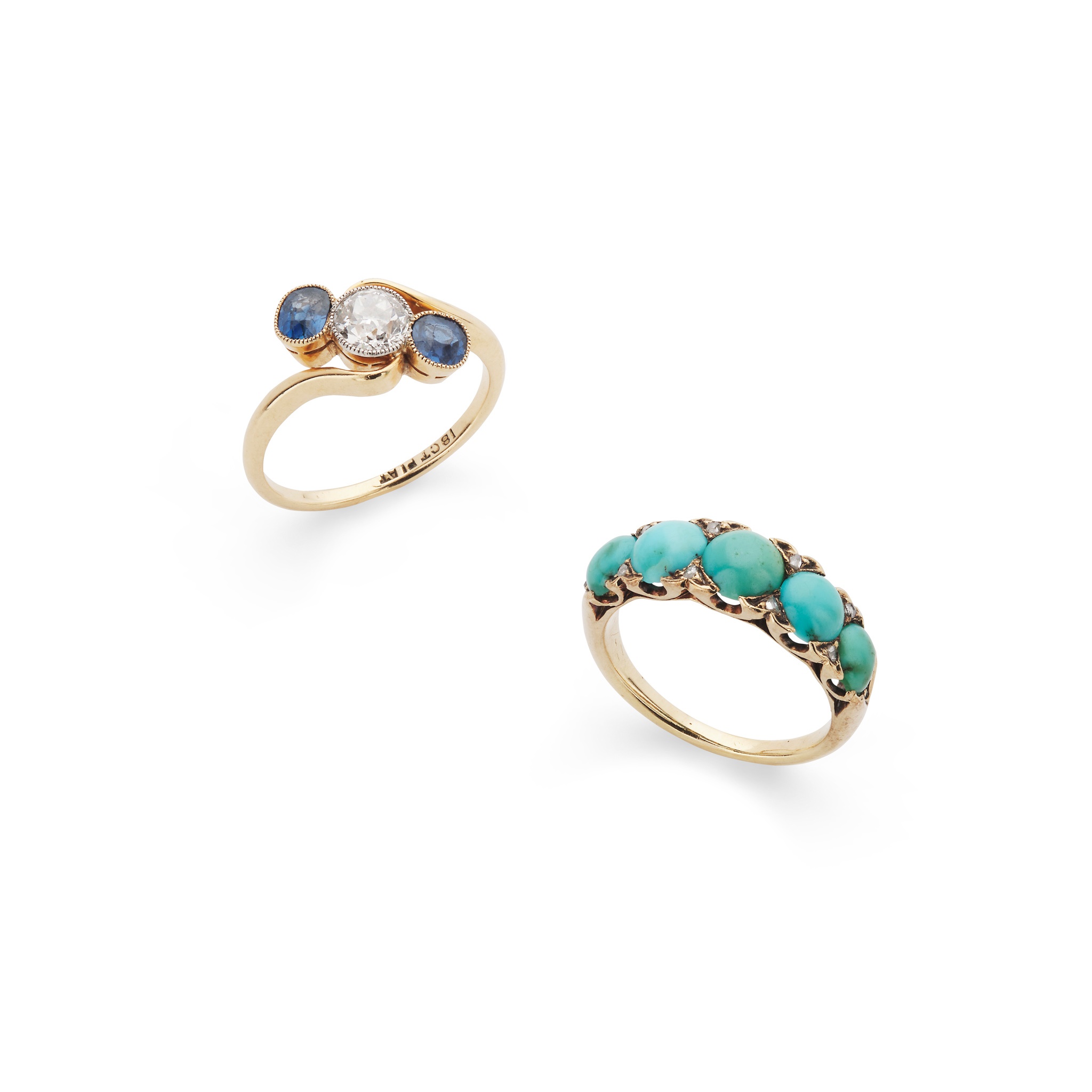 Including a sapphire and diamond ring, millegrain-set with an old round-cut diamond and two cushion-cut sapphires, stamped 18ct PLAT; together with a cabochon turquoise and diamond chip ring, unmarked