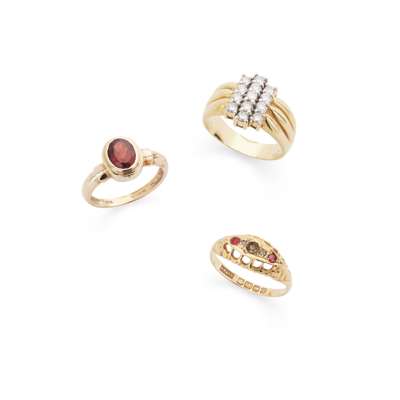 Including a diamond cluster ring, stamped 18k; an 18ct gold ruby, diamond and paste ring, and a 9ct gold garnet ring