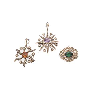 Including an amethyst and seed pearl star brooch/pendant, stamped 9ct; a citrine and seed pearl brooch, unmarked; and a green tourmaline and seed pearl brooch, modelled in 9ct gold