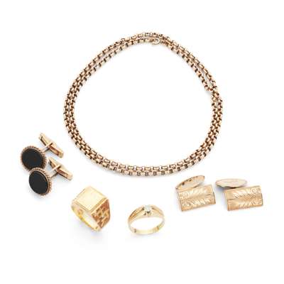 Including an 18ct gold diamond ring, a 9ct gold belcher link chain; two pairs of 9ct gold cufflinks and a signet ring with indistinct marks