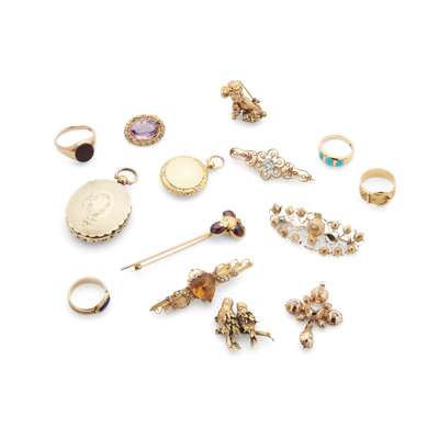 Including a 9ct gold brooch modelled as a poodle, and another modelled as a pair of birds; a 9ct gold citrine and seed pearl bar brooch, another set with an aquamarine and seed pearls, stamped 15ct; a late 18ct century Spanish/Portuguese brooch and pendant, unmarked; various brooches, lockets and rings