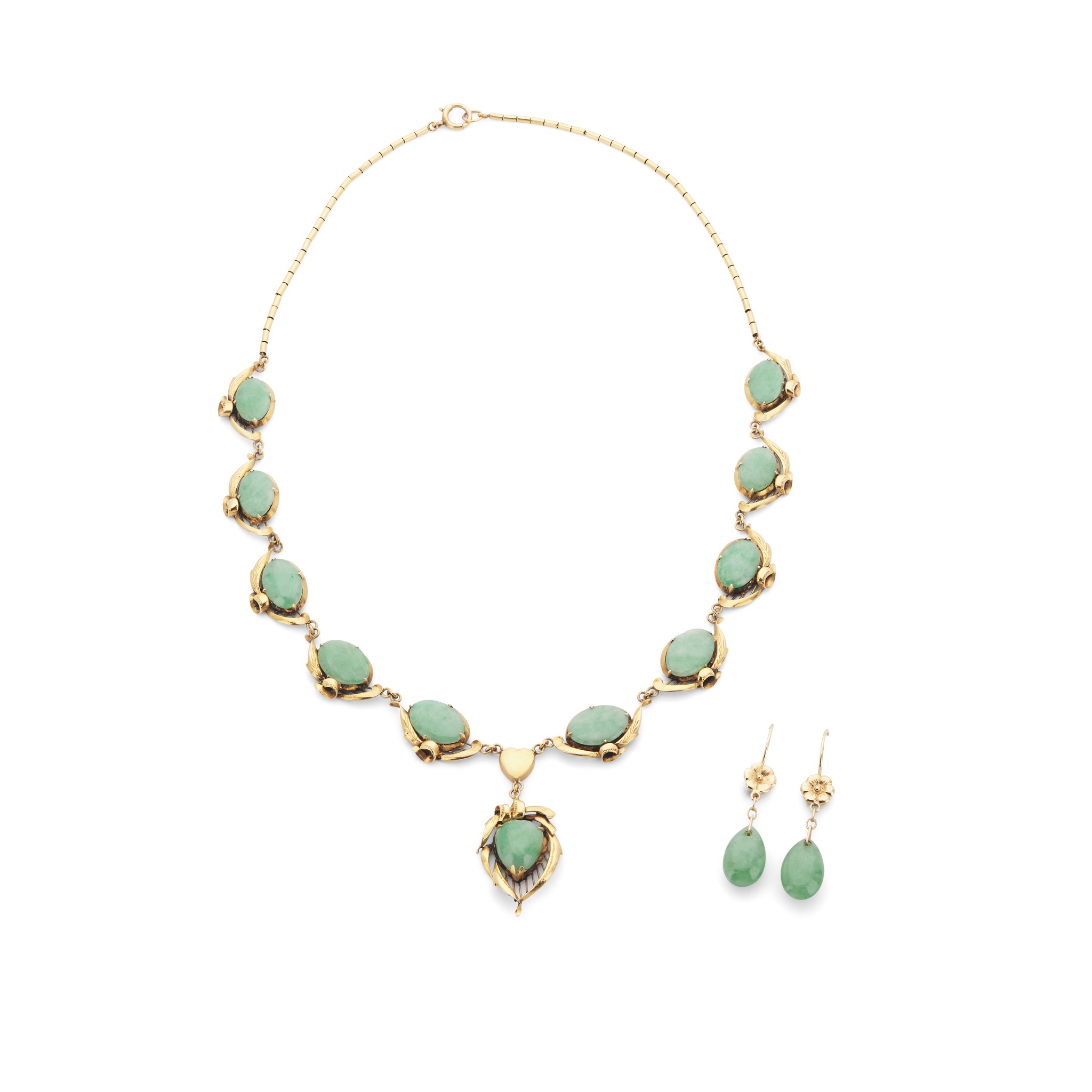 The necklace composed of stylised scrolling links set with cabochon jade, unmarked; together with a pair of associated jade pendent earrings, unmarked