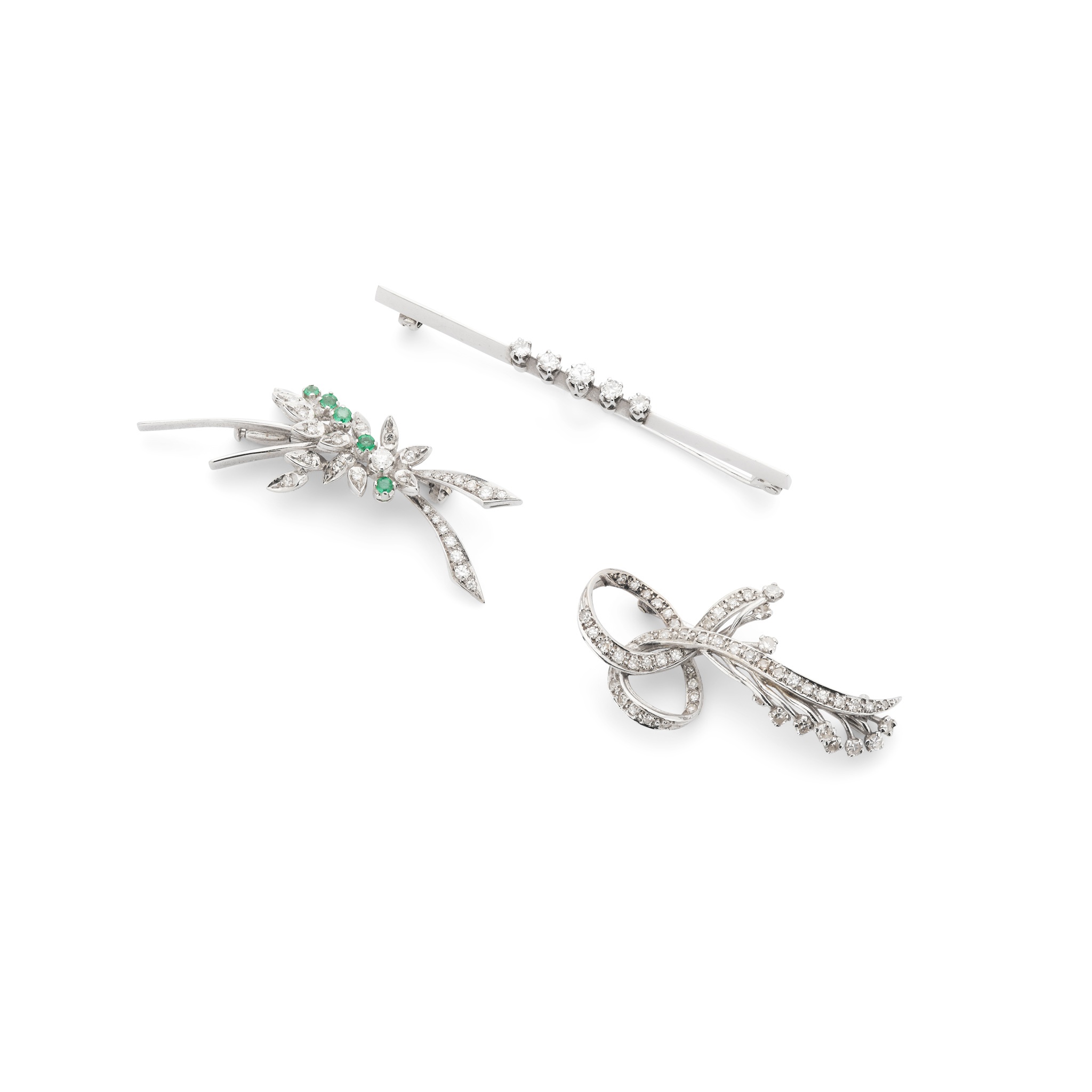 Including a bar brooch set with five old round-cut diamonds, unmarked; an 18ct gold emerald and diamond floral spray brooch, and a diamond brooch of scrolling motif, unmarked