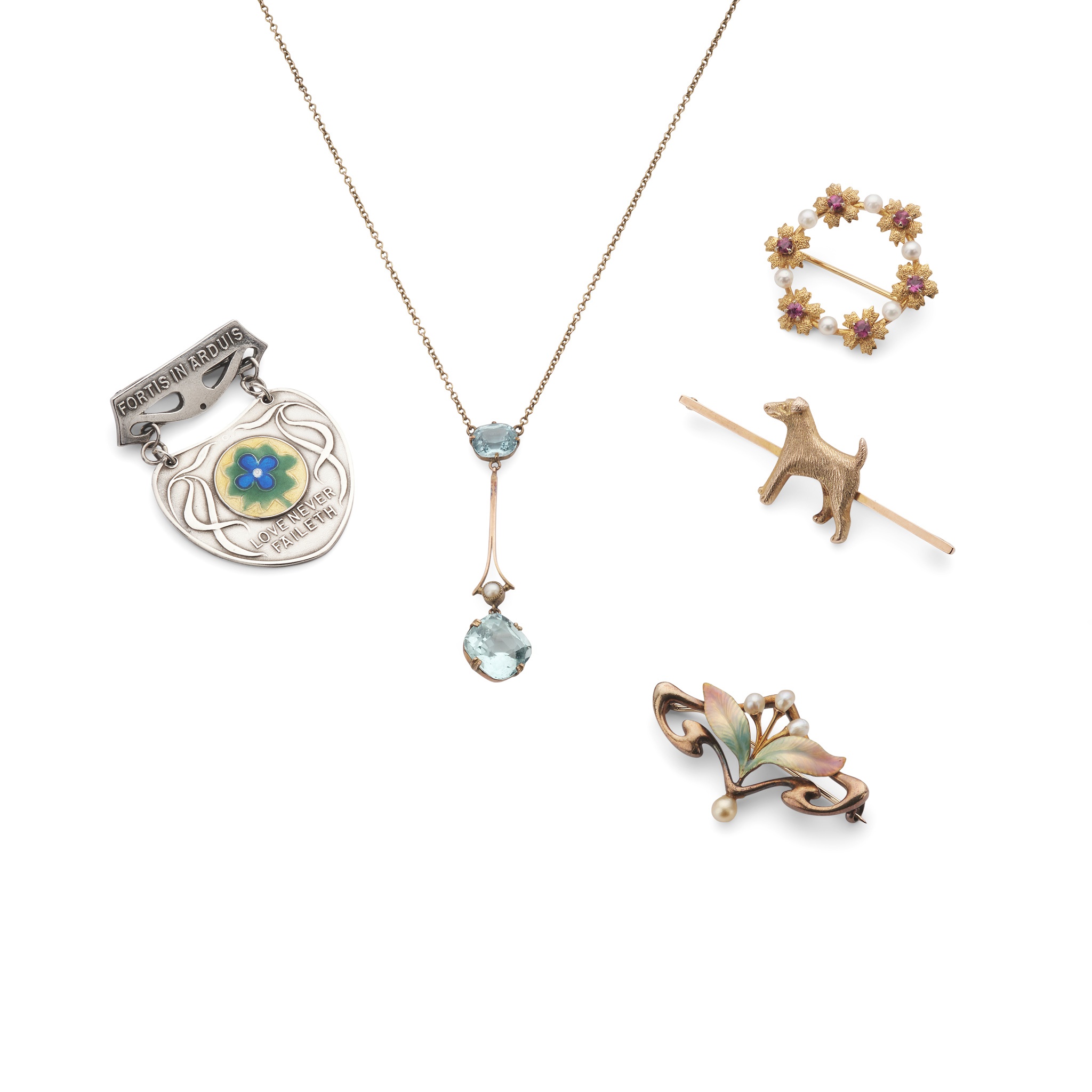 Including an aquamarine and seed pearl pendant, unmarked; a bar brooch with applied detail of a wire-haired terrier, stamped 9ct; an enamel and seed pearl Art Nouveau brooch, unmarked; a ruby and seed pearl brooch, unmarked; and a silver and enamel badge for highest merit and faithful service from the Norland Institute