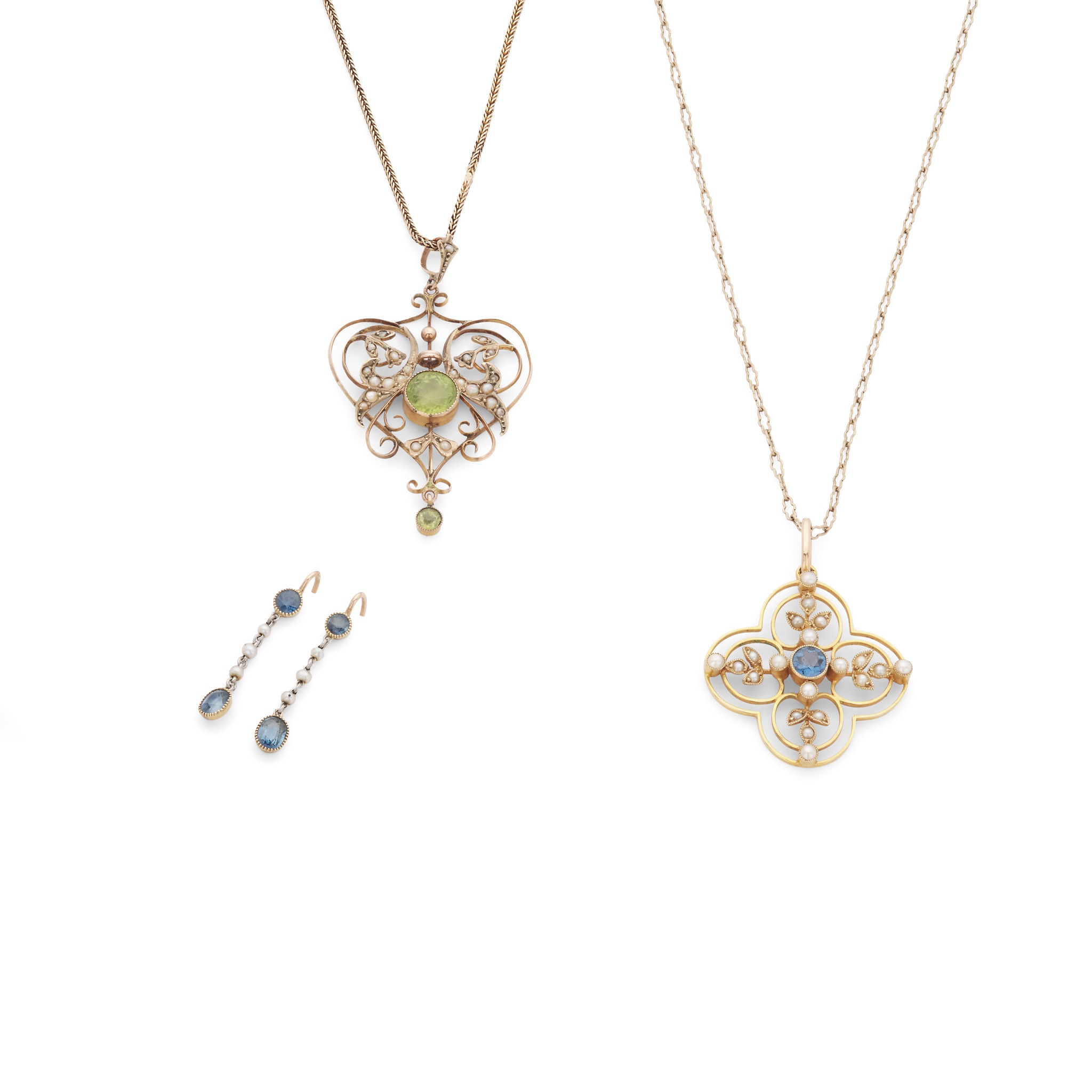 Of pierced quatre-foil design, set with seed pearls and a round-cut sapphire, unmarked; together with a peridot and seed pearl pendant, stamped 9ct; and a pair of sapphire and seed pearl earrings