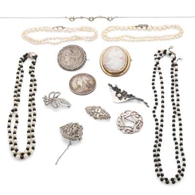 Including two strands of cultured pearls, two cultured pearl and onyx bead necklaces; a shell cameo brooch, unmarked; various silver or costume jewellery brooches, necklaces, coins etc.
