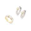 The ring collet-set with a round brilliant-cut diamond to a bi-coloured mount, stamped 750; the earrings of matching design, hinged post fittings, modelled in18ct gold