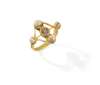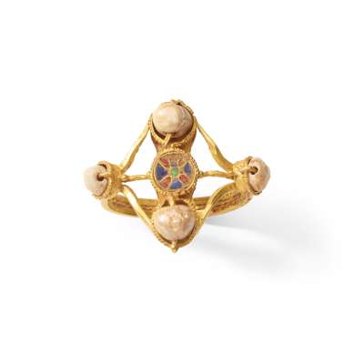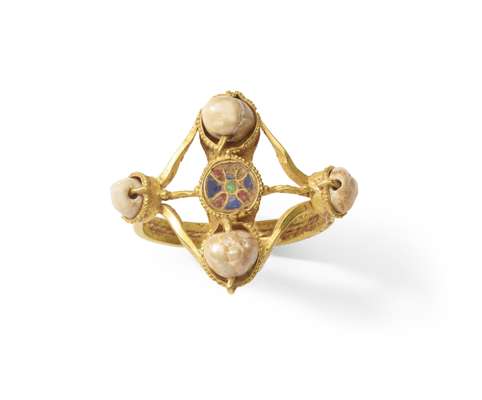 The four pearls set in gold, bordering a central blue, red and green cloisonné enamel bezel, the flanged edge fringed in granulation, the gold shank with recessed ridge