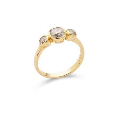 Collet-set with three old cushion-cut diamonds, stamped 750
