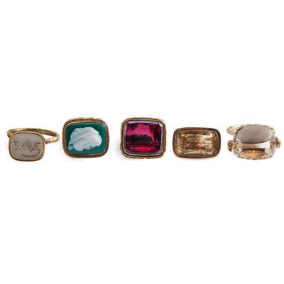 Various dates and sizes, set with hardstone or quartz matrix, all unmarked (5)