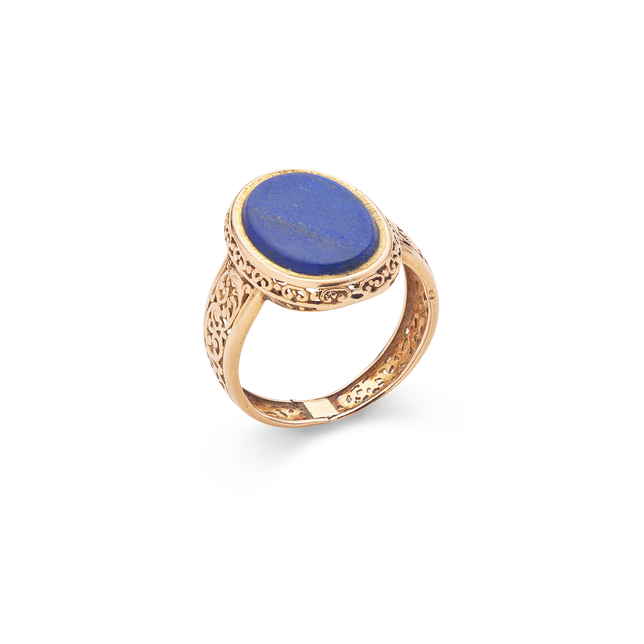 Collet-set with a lapis lazuli panel, the border and band with pierced scrolling detail, unmarked