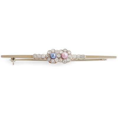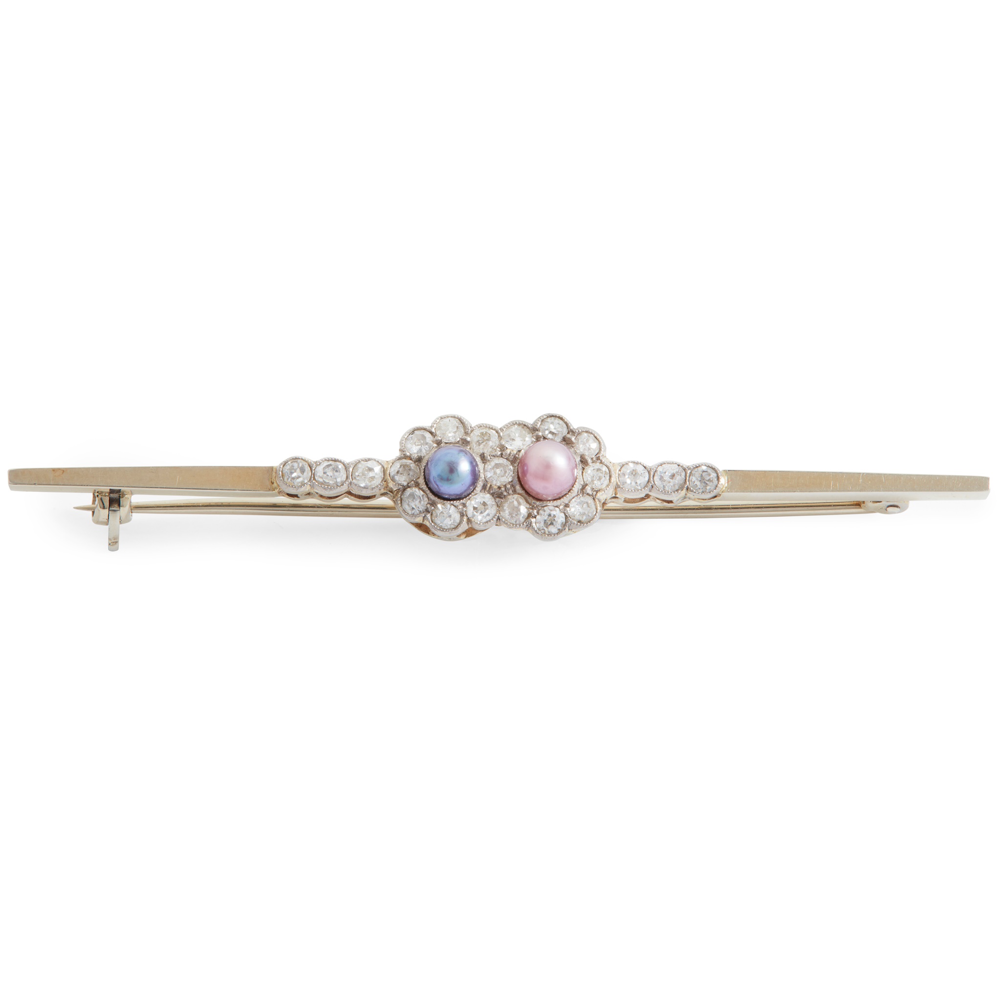 Set with two small coloured pearls, in a border of old round-cut diamonds, to a plain bar brooch, stamped 18ct