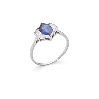 Collet-set with a hexagonal step-cut sapphire, each shoulder set with a tapered baguette-cut diamond, unmarked