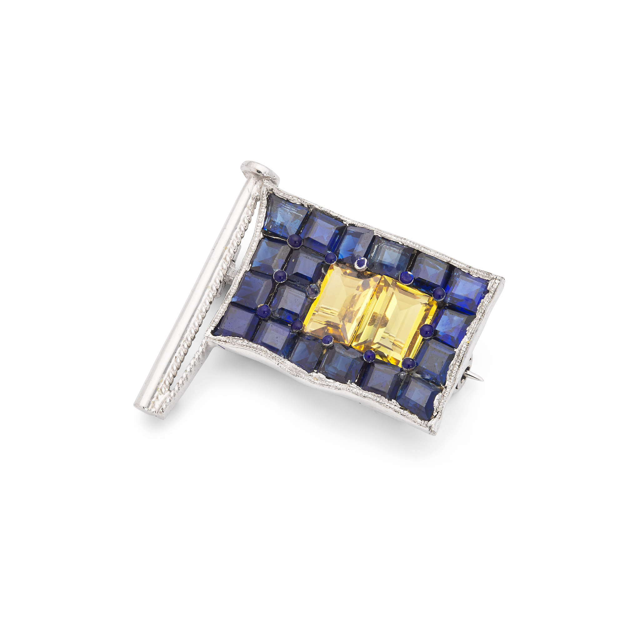 Claw-set with square step-cut blue sapphires and two baguette-cut yellow sapphires, enamel detail to claws, modelled in 18ct gold