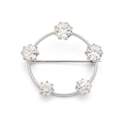 Of circular outline, claw-set with five graduated old round-cut diamonds, unmarked