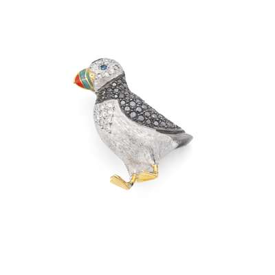 Pavé-set with round brilliant-cut colourless and black diamonds, with a cabochon sapphire eye and enamel detail to the beak, modelled in 18ct gold