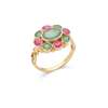 Collet-set with oval-cut rubies and emeralds, pierced detail to shoulders, modelled in 18ct gold