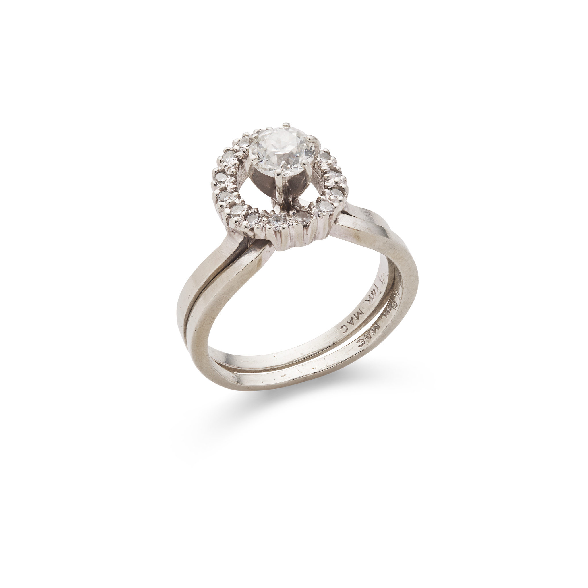 Including an old round-cut single-stone diamond ring, weighing approximately 0.45cts, and a fitted round brilliant-cut diamond halo, both stamped 14K (2)