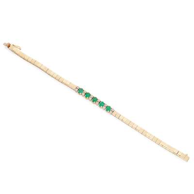 Claw-set with five oval-cut emeralds between pairs of round brilliant-cut diamonds, stamped 585