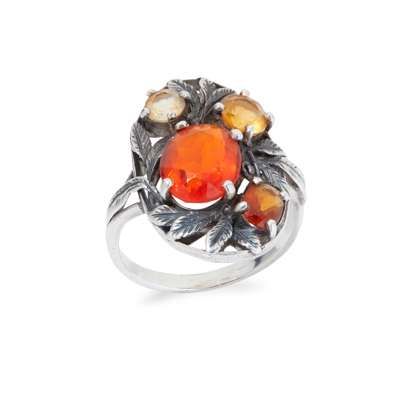 Claw-set with an oval-cut fire opal and three oval and round-cut citrines, in a foliate surround, unmarked; in original Bernard Instone box