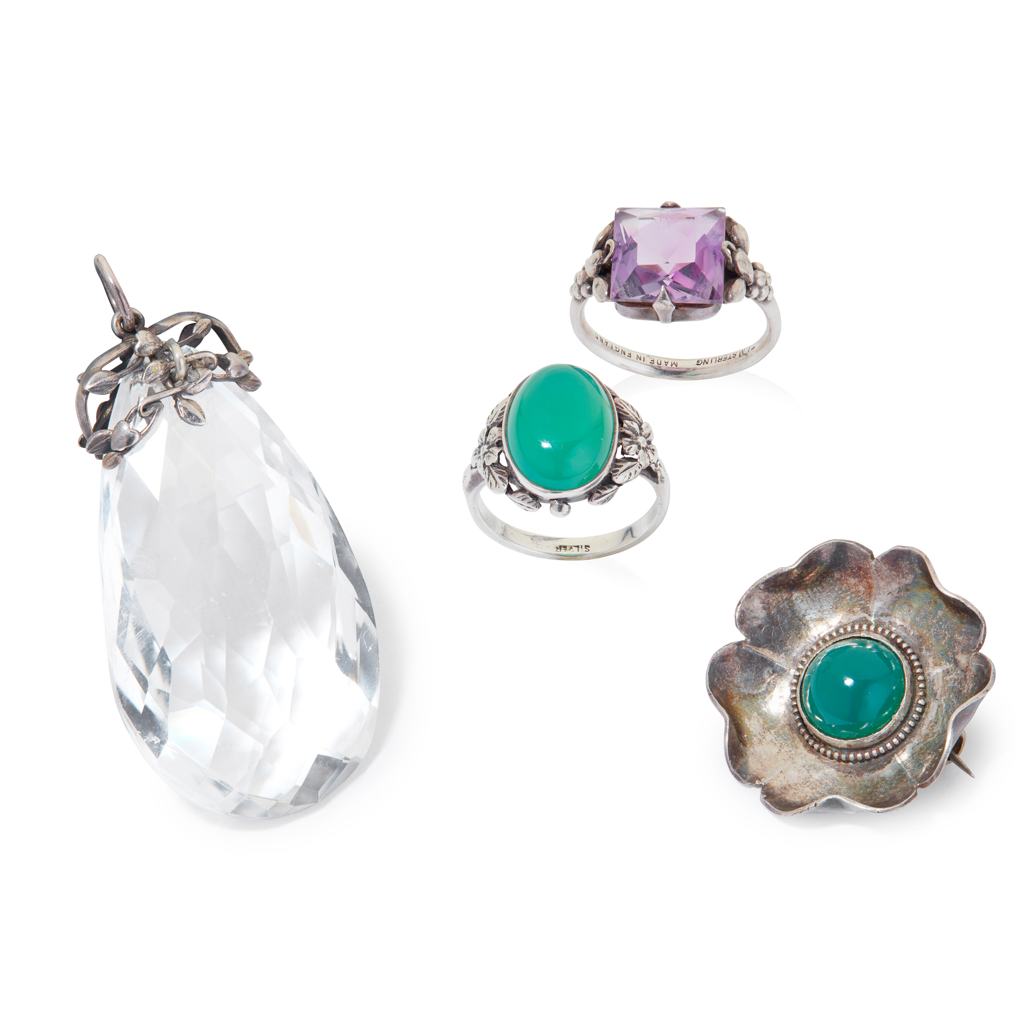 Including a cabochon green hardstone ring, stamped SILVER; an amethyst ring by Thomas L Mott, stamped TLM SILVER; a facetted rock-crystal pendant with foliate mount, unmarked; and a small cabochon chalcedony floral brooch, possibly C. R Ashbee, unmarked (4)