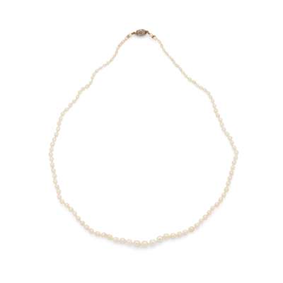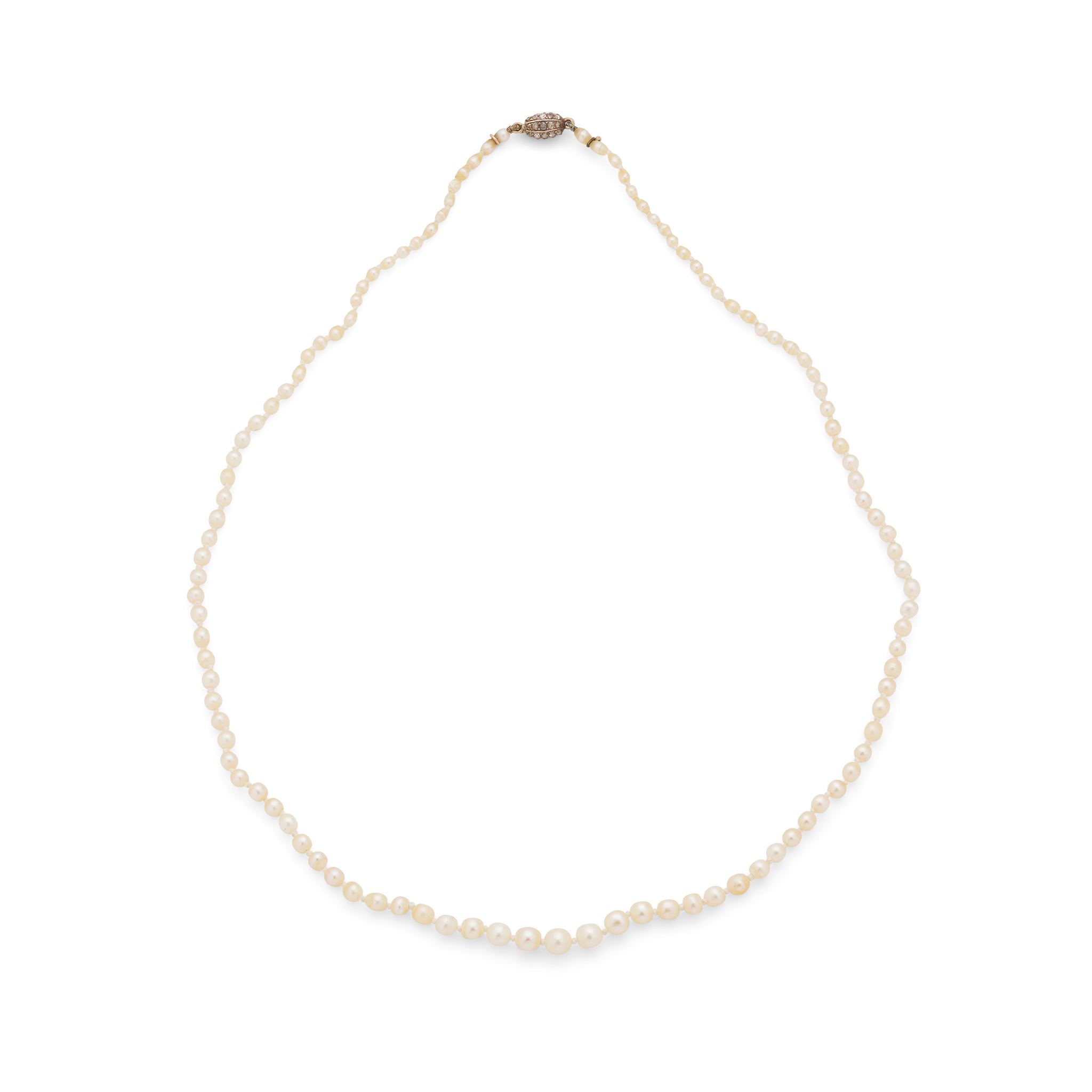 Composed of a single row of (untested) pearls, the barrel clasp set with rose-cut diamonds, unmarked