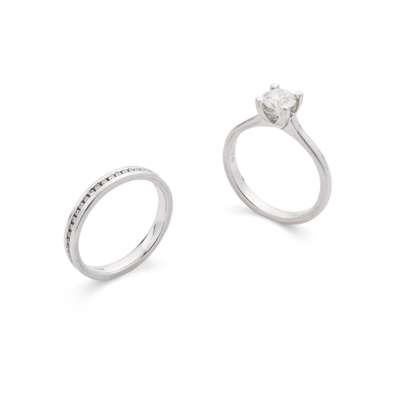 Claw-set with a round brilliant-cut diamond, weighing approximately 0.65cts; together with a matching diamond half-eternity ring, both modelled in platinum (2)
