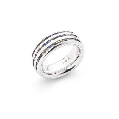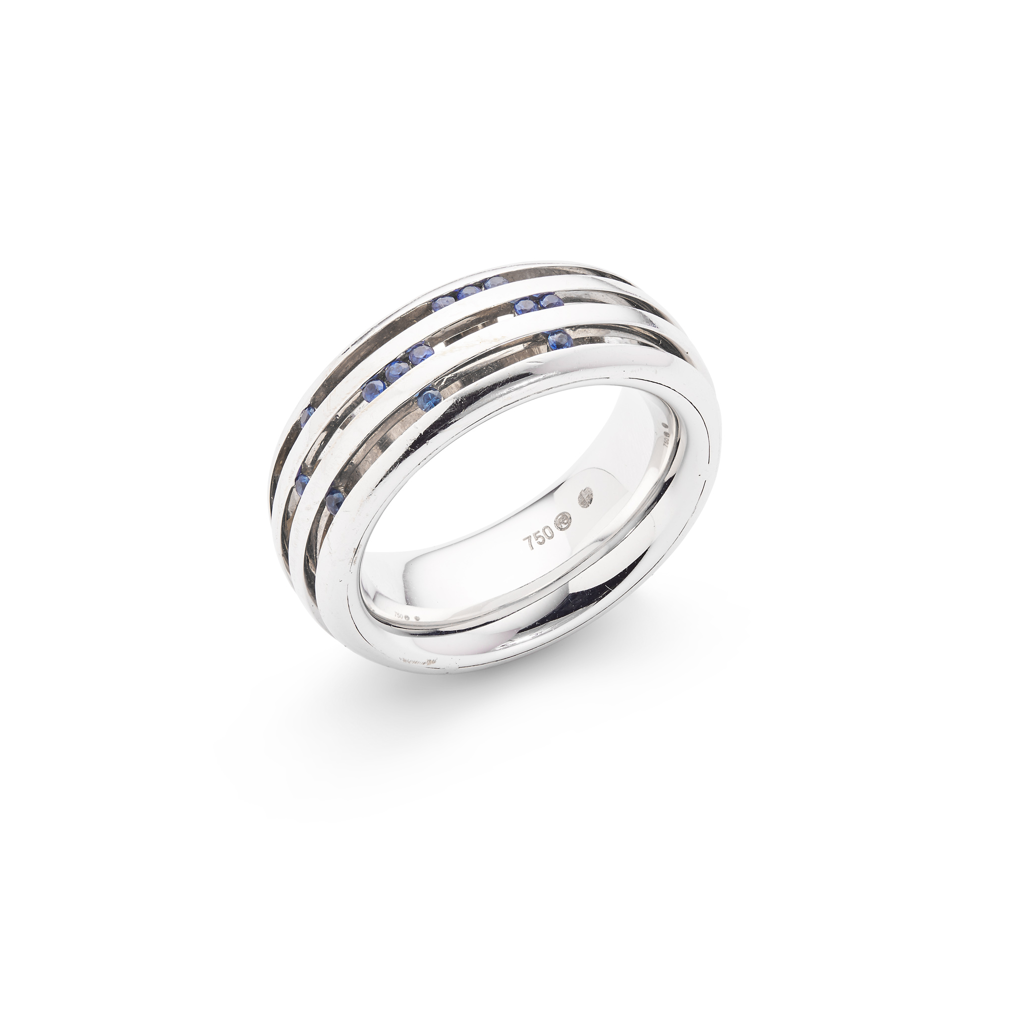 The broad band channel-set at intervals with three rows of round-cut sapphires, stamped 750