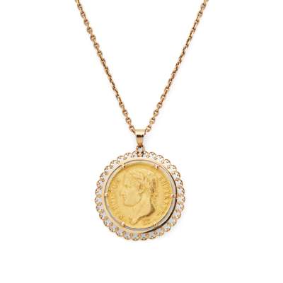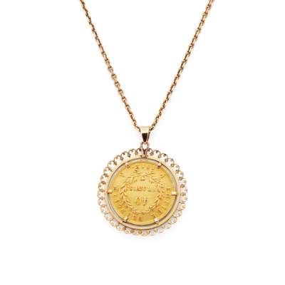 The 40 franc coin claw-set in a decorative mount, to a trace-link chain, both with French assay marks