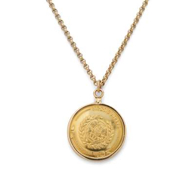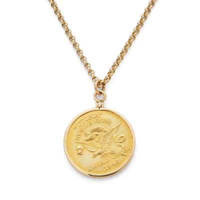 The medal collet-set in a plain mount, unmarked, suspended from a 9ct gold belcher-link chain