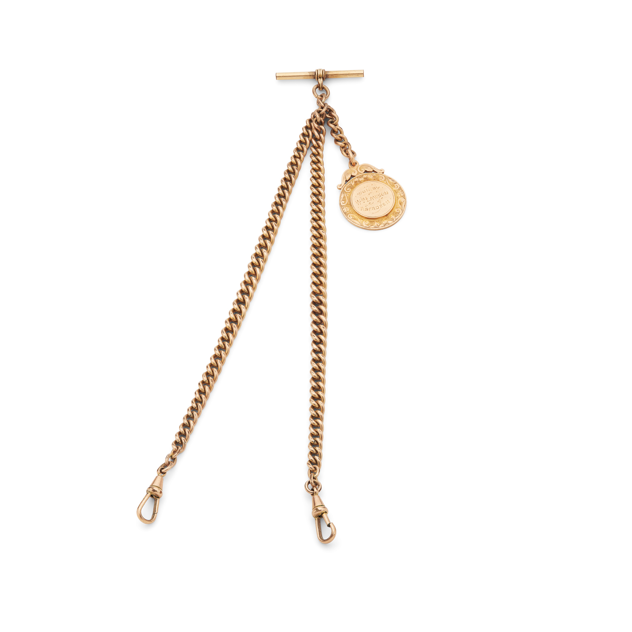 Composed of curb-links, indistinctly marked, suspending a T-bar and 9ct gold engraved medal