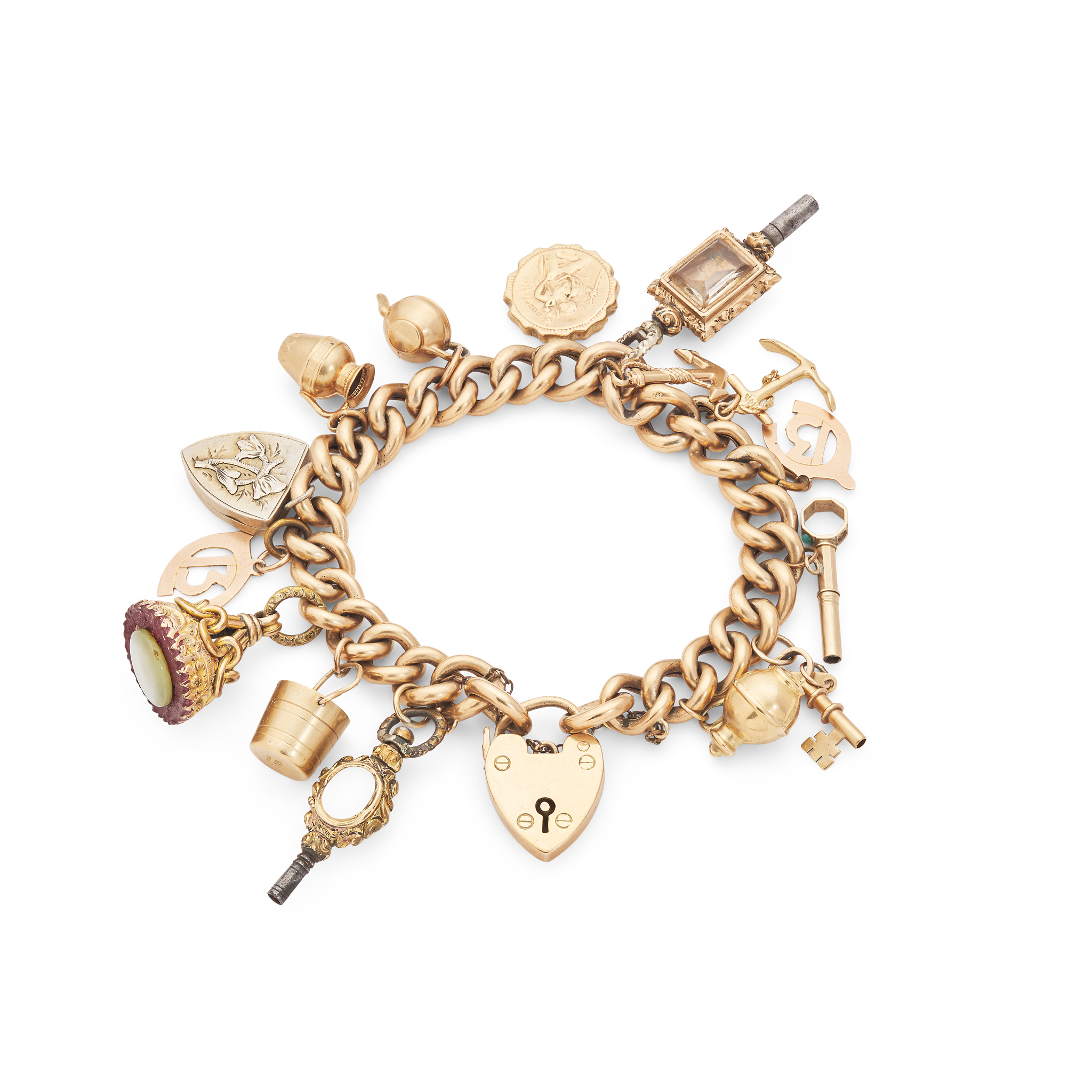 Composed of curb links, suspending various charms including a bucket, a watch key and an anchor etc., unmarked