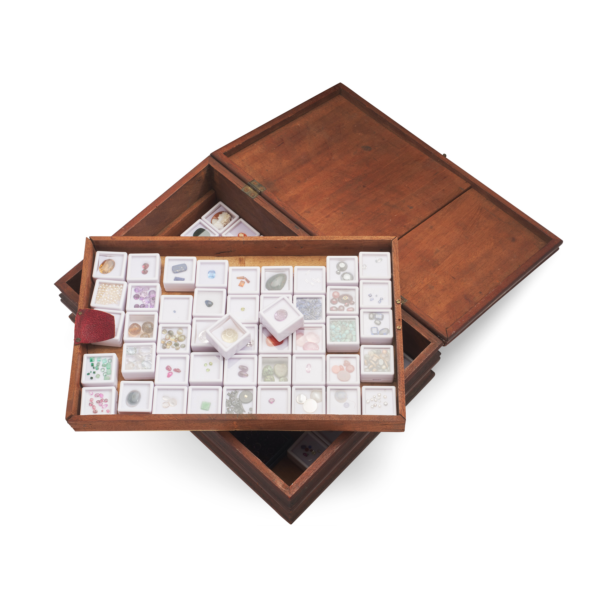 Various examples including diamonds, rubies, emerald, sapphires, topaz, garnet, amethyst, quartz, hardstones, synthetic rubies and sapphires etc., presented in a wooden specimen box (Qty)