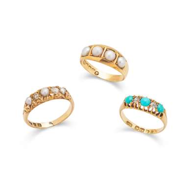 Including an 18ct gold split pearl ring, an 18ct gold turquoise and diamond ring; and an 18ct gold split pearl and diamond ring (3)