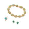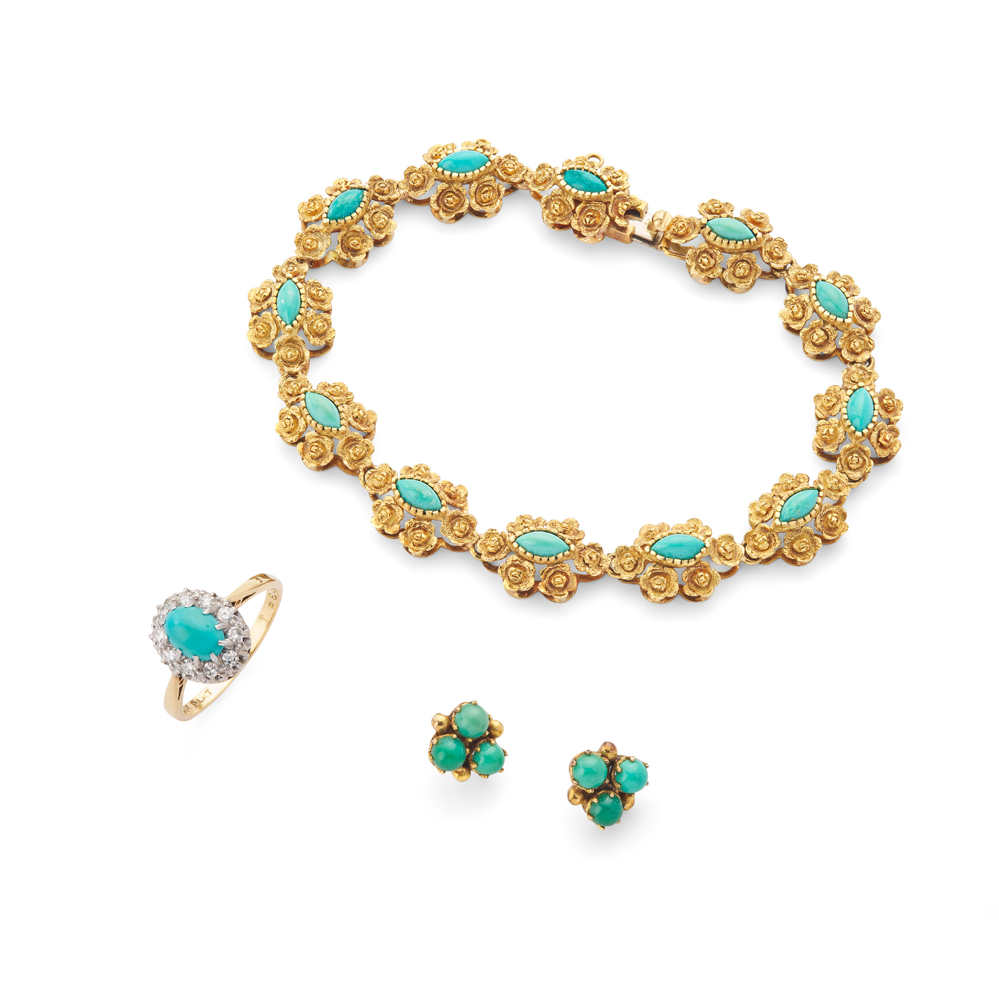 Including an 18ct gold bracelet set with marquise cabochon turquoise, a pair of cabochon turquoise cluster earrings, unmarked; and a turquoise and diamond cluster ring (3)