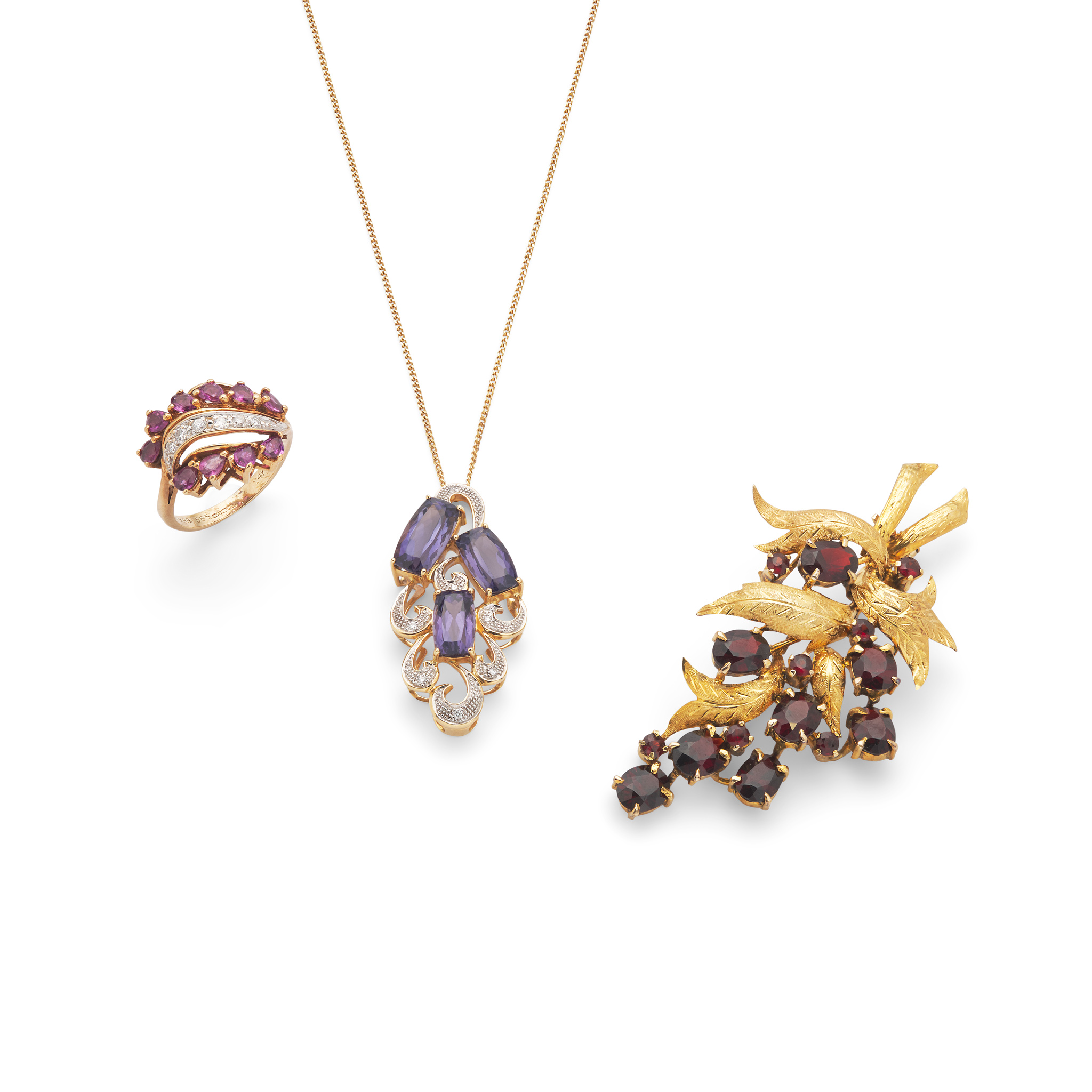 Including a 9ct gold garnet set floral spray brooch; an iolite and diamond cluster pendant, modelled in 18ct gold, to a trace-link chain; a purple tourmaline and diamond cluster ring, modelled in 14ct gold (3)