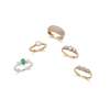 Including a 9ct gold pavé-set diamond dress ring, two three-stone diamond rings, both stamped 18CT PLAT; a diamond single-stone ring, stamped 18CT PLAT; an emerald and diamond three-stone ring, stamped 750 (5)
