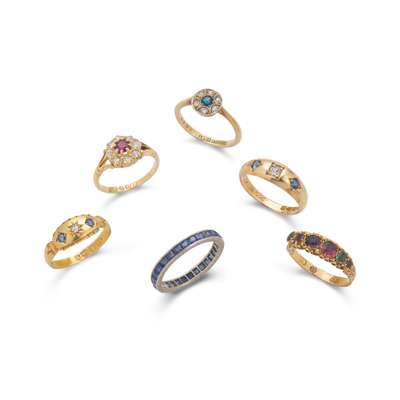 Including two 18ct gold sapphire and diamond rings, an 18ct gold ruby and diamond cluster ring; a 15ct gold multi-gem ring, an unmarked sapphire eternity ring and a sapphire and diamond cluster ring, stamped 18ct (6)