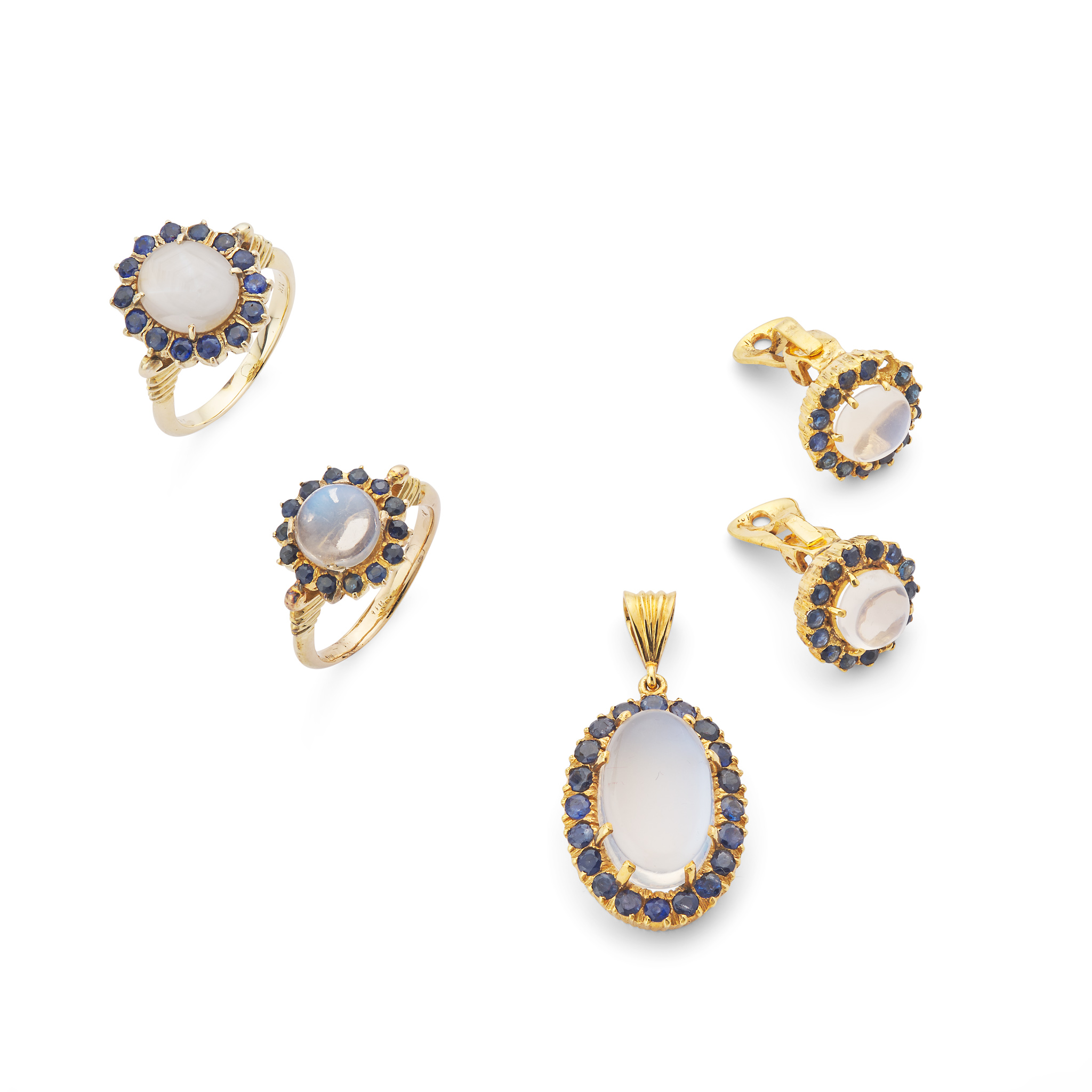 Including a pair of earrings, a pendant and two rings, each modelled as a cabochon moonstone and round-cut sapphire cluster, rings stamped 14k (4)