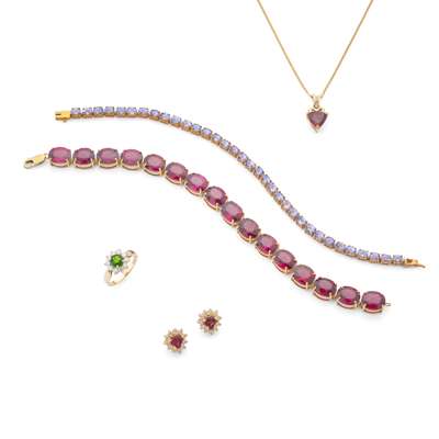 Including a pair of garnet and diamond cluster earrings, stamped 9k; a Tanzanite line-bracelet, stamped 375; a green garnet and diamond cluster ring, modelled in 18ct gold, a 9ct gold triangular-cut garnet pendant, modelled in 9ct gold; and a garnet bracelet, unmarked (5)