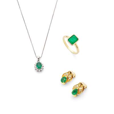 Including an emerald and diamond cluster pendant, stamped 18k, to a trace-link chain stamped 750; a pair of emerald and diamond clip earrings, stamped 750; and a collet-set emerald ring, unmarked (3)