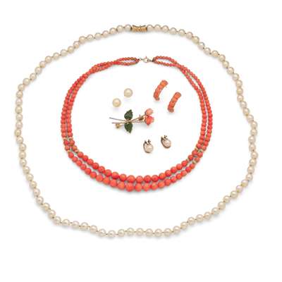 Including a double-strand coral bead necklace, a pair of cabochon coral half-hoop earrings and a carved coral and green hardstone brooch, modelled as roses; together with a single strand of cultured pearls and two pairs of cultured pearl earrings (6)