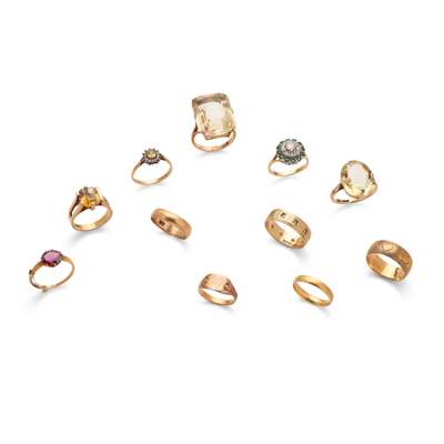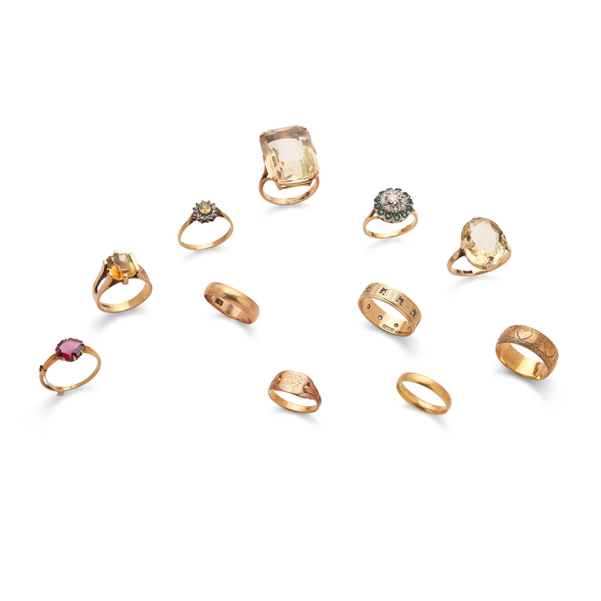 Including three citrine cocktail rings, a fancy-cut garnet ring, unmarked; an emerald and diamond cluster ring, stamped 18ct; various other wedding bands etc. (11)