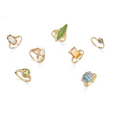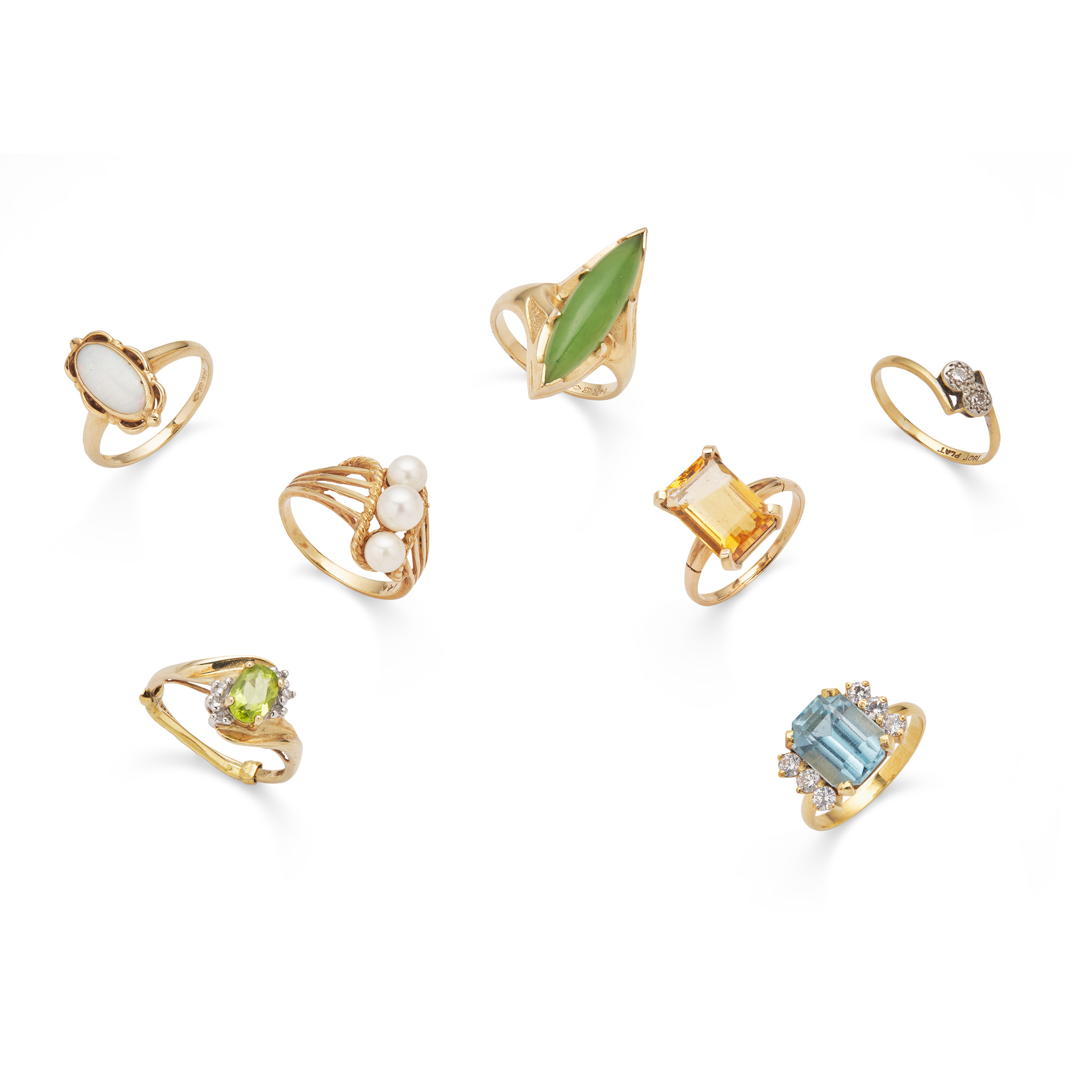 Including a cultured pearl dress ring, stamped 14k; a jade dress ring, stamped 14k; a citrine cocktail ring and an opal dress ring, both stamped 14k; a two stone diamond ring, stamped 18k; a peridot and diamond ring, indistinctly marked and an aquamarine and colourless gem ring, indistinctly marked (7)